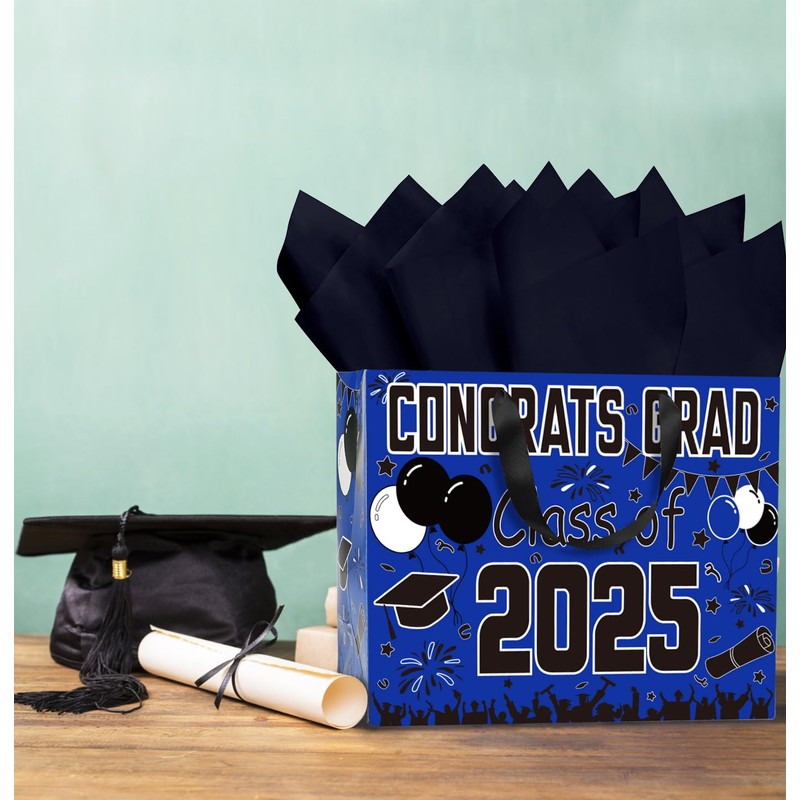 - Widely used: Gift bag with black tissue paper is suitable for different graduation occasions such as junior, high school, college and doctorate graduation parties. Using the large graduation gift bag will add a joyful atmosphere