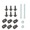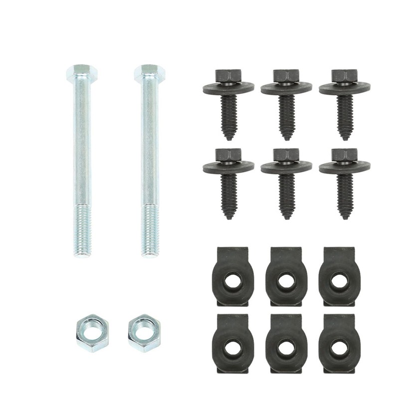 Includes 6 J-Clips and 6 Bolts ( 1/2"-13 x 5" ) to attach the front mounting brackets to the body for both sides. And also two long spring eye bolts/nuts to attach the front leaf spring eye to the mounting brackets.
