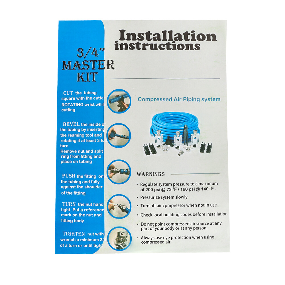 • 100 ft M6030 Tubing (3) M81010 Aluminum Blocks (3) M8005 ¾” Tubing x 1/2” NPT fittings (3) 50136 ½” npt Plugs (3) 50120 3/8” npt Drain Valves (1) M8003 ¾” Tubing x ¾” NPT Fitting (2) M8011 Tee Fittings (2) M8065 10 PACK Tubing Clips (20 clips total) (1) M8091 Cutter (1) M8095 Bevel Tool