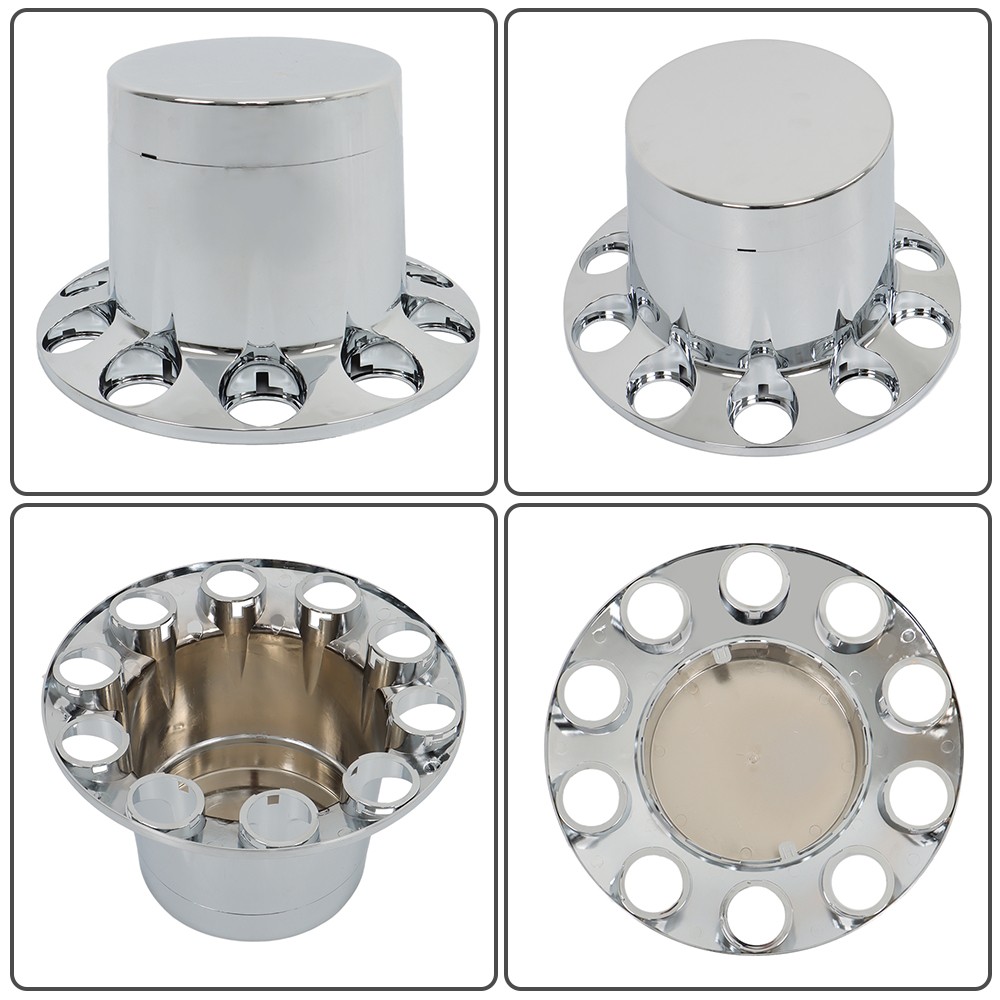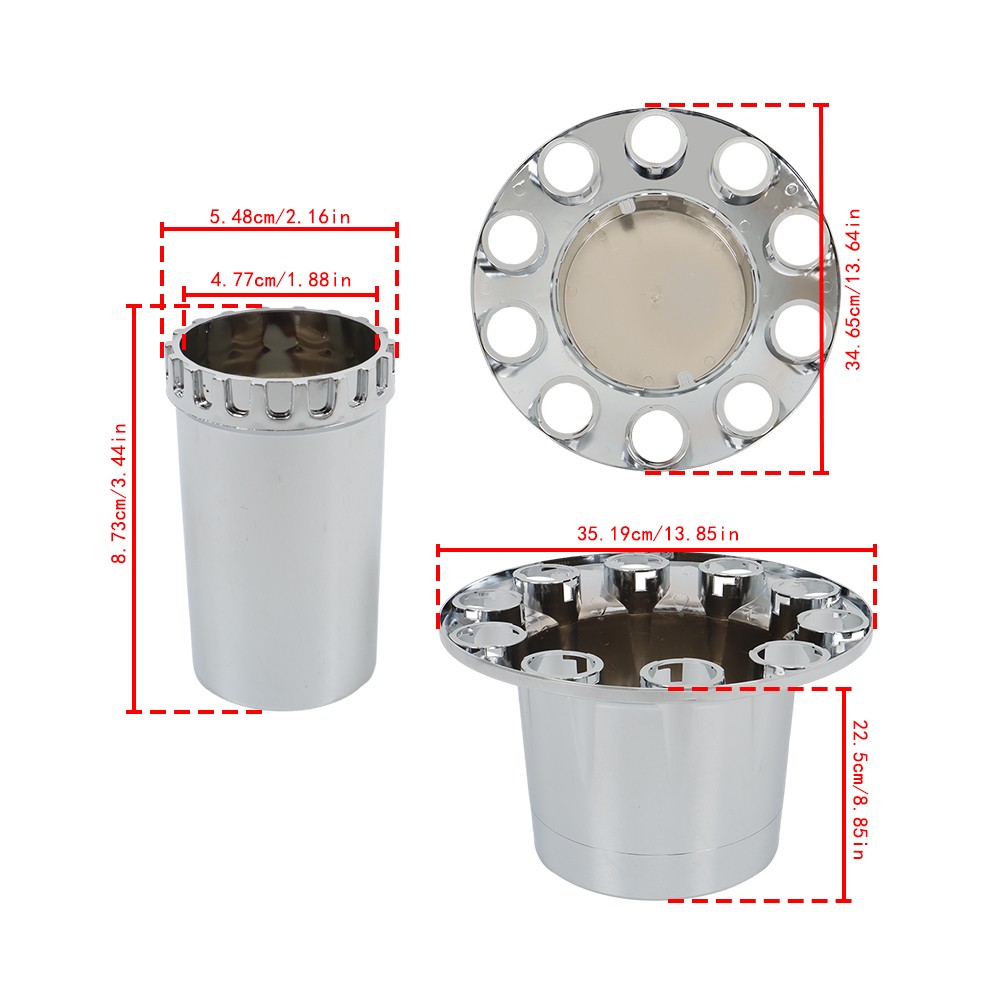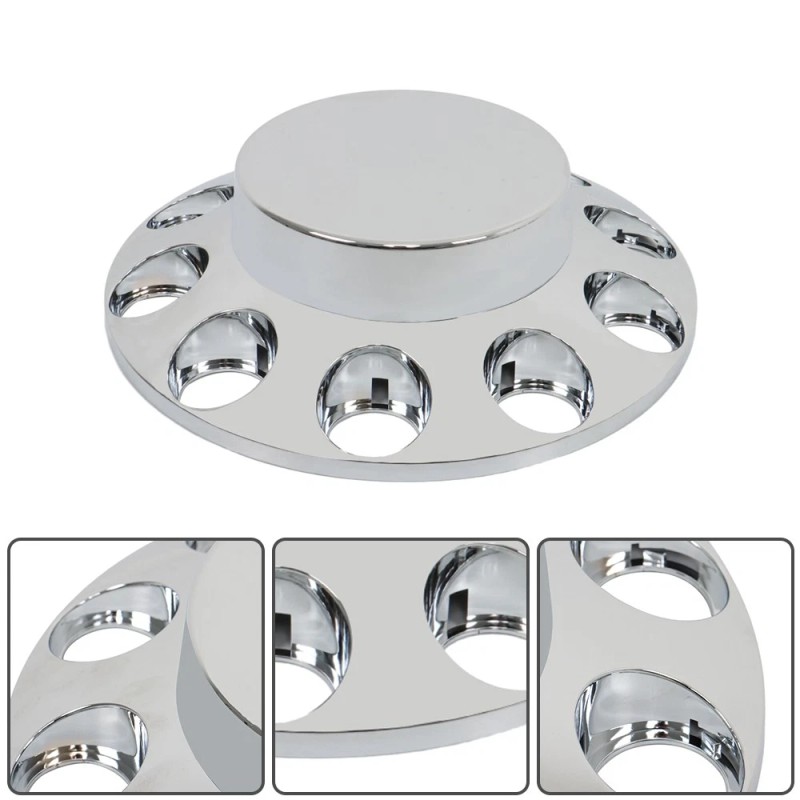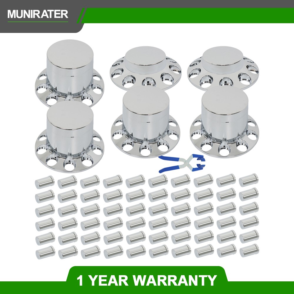 CONDITION——New WARRANTY——1 Year BRAND——Munirater COLOR——Silver TYPE——Hub Cap MATERIAL——Chrome, Plastic PLACEMENT ON VEHICLE——Front,, Rear FIT FOR——For semi trucks, middle-duty trucks, heavy-duty trucks and trailers Kit Includes——Chrome Plastic Front Axle Cover x 2,Chrome Plastic Rear Axle Cover x 4,Thread-On Cylinder Nut Covers x 60,Nut Cover Tool x 1