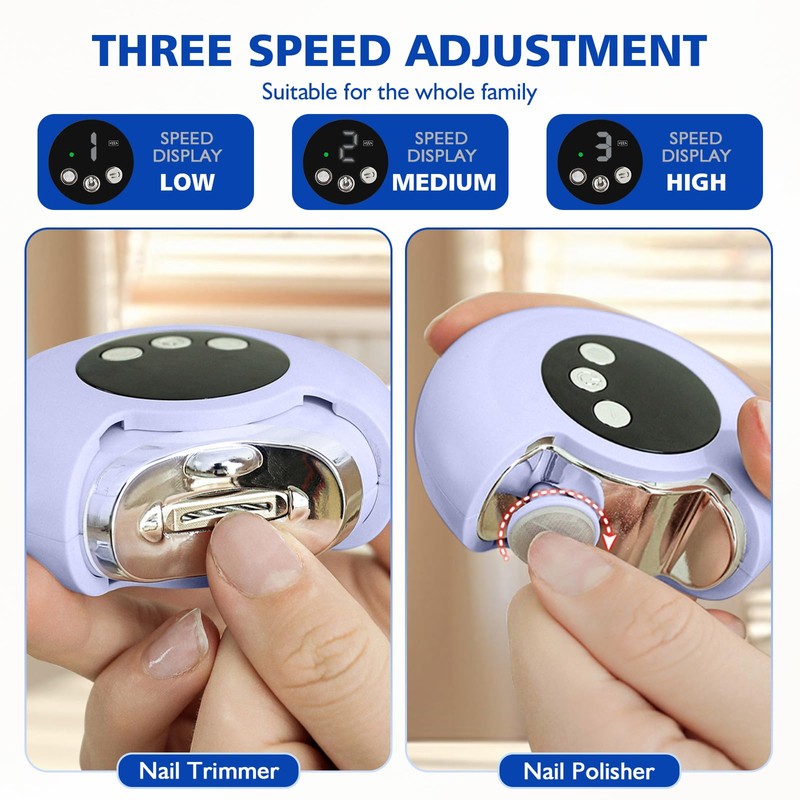 3-in-1 automatic electric nail clipper with Auto Storage Function electric nail clippers for adults combine trimming, filing and polishing in one, the electric nail trimmer for adults is one-button operated, just press the button, the automatic nail clippers for adults can complete the work of trimming nails, grinding and filing nails and polishing nails, the automatic nail clipper has a built-in nail collector that can automatically remove nail debris. No need to use other tools separately, the multi-function 2 in 1 electric polishing automatic nail clippers for seniors bring you a comprehensive nail care experience, electric toe nail clippers for adults make nail trimming easy, neat and smooth. automatic electric nail clipper with high safety and 360° swivel design The blades of the electric nail clippers for seniors are hidden in curved grooves, with recessed cutters that perfectly separate nails and are carefully shielded to prevent accidental contact with the skin, ensuring that every trimming is done with precision and safety. The electric toenail clippers for seniors feature an innovative 360° swivel design that allows for easy switching between trimming, polishing and charging functions, greatly enhancing ease of operation. electric nail clippers for adults 3 Speed Adjustment and Rechargeable Portable Design This electric nail trimmer for adults is equipped with 3 adjustable speed settings of low, medium and high and display speed 1/2/3, which is suitable for children, adults and the elderly, and various nail types and thicknesses. The electric fingernail clippers are equipped with 500mAH high capacity battery, automatic nail clipper uses Type-C cable (supplied), after a full charge, electric nail clippers for men can be used for a long time, automatic electric toe nail clipper with led light is compact and small, electric nail cutter is very suitable for travelling or business trips to carry. Front LED light and low noise 2 in 1 electric polishing automatic nail clippers for seniors The automatic nail clipper is equipped with an LED light for improved visibility, allowing you to see the nail area clearly even in low light for more precise trimming, and the electric nail clippers for toenails' battery level indicator allows you to monitor the remaining power in real time and recharge the battery in a timely manner. In addition, the electric toe nail clippers for adults work at ≤40dB, providing a quiet environment for nail care.The electric automatic nail clipper is perfect for people who are sensitive to sound, such as babies and the elderly. No need to worry about the noise disturbing your baby's rest. 2 in 1 electric nail clipper is an Ideal Gift Choice As a manicure tool, this electric nail trimmer for adults is suitable for all ages such as babies, teens, adults, seniors and the elderly. The functionality and stylish design of the electric fingernail clippers make it a thoughtful and practical gift for family, relatives or friends at baby showers, birthdays, Christmas, Thanksgiving or any other special occasions, encouraging the recipients to maintain their nail care habits with ease and precision. Features of 2 in 1 electric polishing automatic nail clippers for seniors 1. 3-in-1 design, electric nail cutter with both nail trimming, polishing and filing functions, complete multiple care needs at once, save time and effort. 2. electric design, electric toe nail clippers for adults, automatic electric toe nail clipper with led light avoid accidental injuries caused by electric nail clippers for seniors. 3. electric nail clippers for men multiple speed adjustable design, electric automatic nail clipper suitable for different nail types and thickness, to ensure more accurate trimming effect. 4. Precise polishing function, electric automatic nail clipper makes nails smooth, enhance the beauty of the hand. 5. electric nail clippers for seniors are compact and portable, you can take care of your nails anytime and anywhere, keep your hands clean and tidy. How to use automatic electric nail clipper Open the lid of the electric nail clippers for men Long press the middle button of the automatic electric toe nail clipper with led light to start Click the right button of the electric toenail clippers for seniors to choose the gear (1/2/3 gear), move the nail left and right when trimming Rotate the trimmer of automatic nail clippers for adults to the polisher, click the left button of electric nail clippers for toenails to select the gear (1/2/3 gear) and polish the nails to make them smoother Press the 2 in 1 electric polishing automatic toe nail clippers' storage for cleaning 2025 New electric nail clippers for adults, 2 in 1 electric nail clipper, USB Rechargeable electric fingernail clippers with Nail Chip Storage for Babies, Children and Adults. Product name of automatic nail clippers for adults: 2 in 1 electric polishing automatic toe nail clippers electric toenail clippers Product Size: 8.5x8.5x3.7CM/3.3x3.3x1.6IN electric nail cutter Net Weight: 135g/0.3lb electric nail clippers for toenails Rated Input: 5V-0.3A electric nail trimmers material process: ABS + metal plating automatic nail trimmer charging interface: Type-C electric nail trimmers colour: white, beige, purple