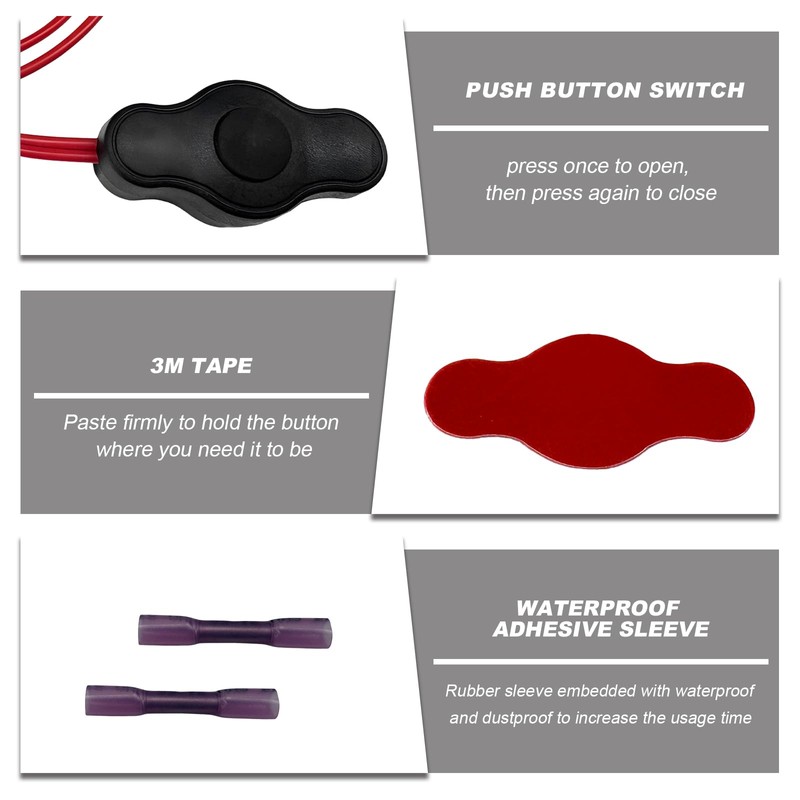 - Contenido del paquete: recibirás un botón de interruptor impermeable de 12 V con cables de doble cableado, junto con una funda de goma y una cinta adhesiva. El paquete es ligero y contiene un juego completo de productos, por lo que es fácil de montar y utilizar después de recibirlo