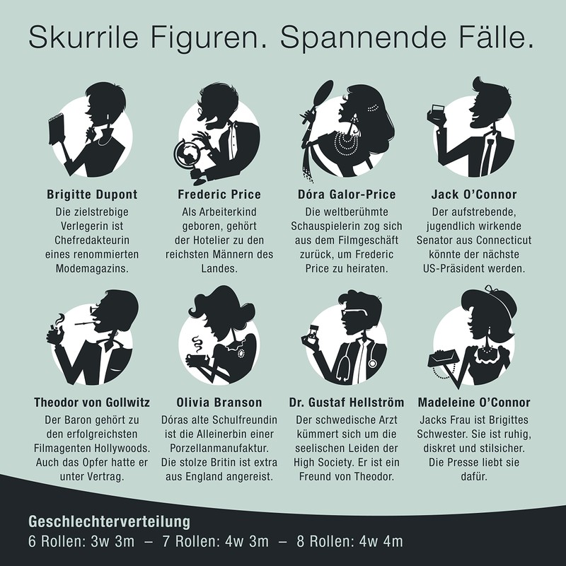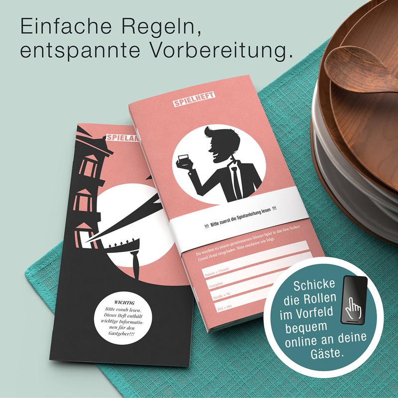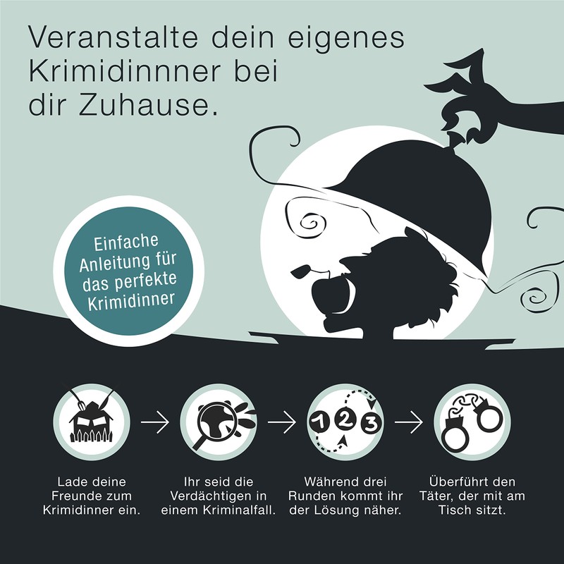 As a host you invite your guests to a shared dinner. Together you’ll solve an exciting crime case. The special features: In this crime, you and your guests slip into the roles of the main suspects. But beware! Each player has their own dark secrets that they would like to keep to themselves. Only together will you have a chance to find the killer who sits with you at the table.