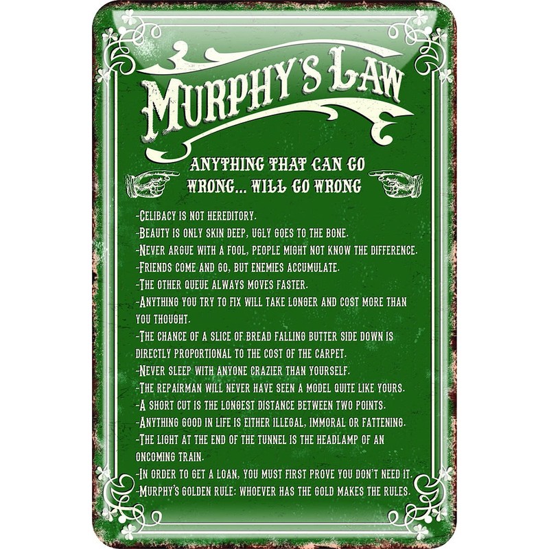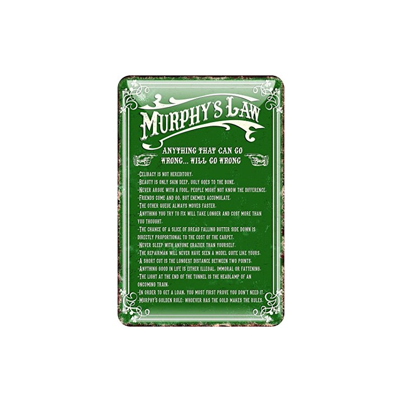 • MURPHY'S LAW METAL SIGN: Anyone who loves interesting, sarcastic sayings with funny philosophical themes will enjoy this Irish Murphy's Law Metal Sign. Made of metal in a stylish rounded rectangular shape, this sign is strong and durable enough to be displayed indoors and outdoors.