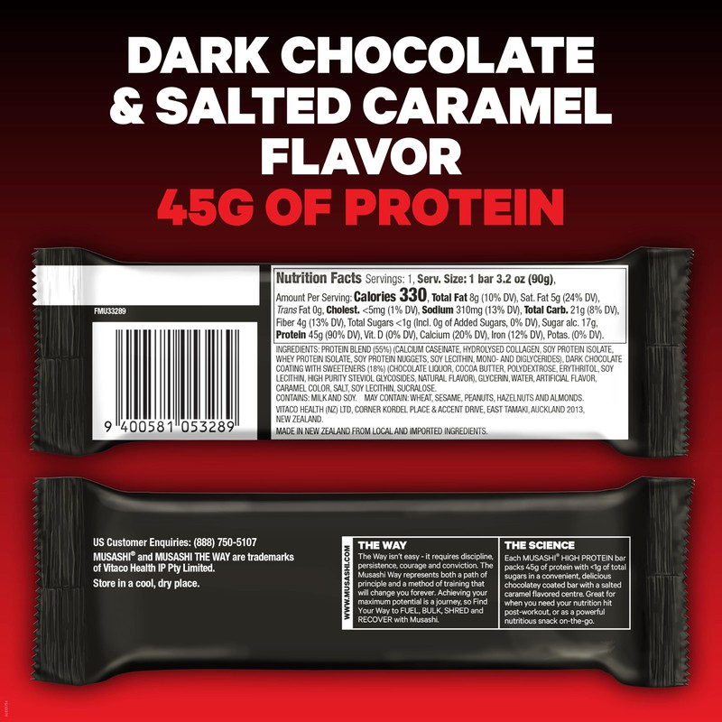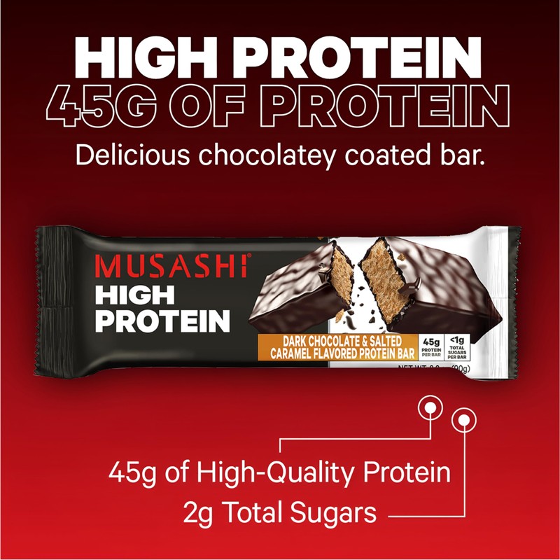 MUSASHI High Protein Bar, 45g Protein, <1g Total Sugars, Dark Chocolate & Salted Caramel, Post Workout and Protein Snack On The Go, 12 Pack of 3.2oz (90g) Bars