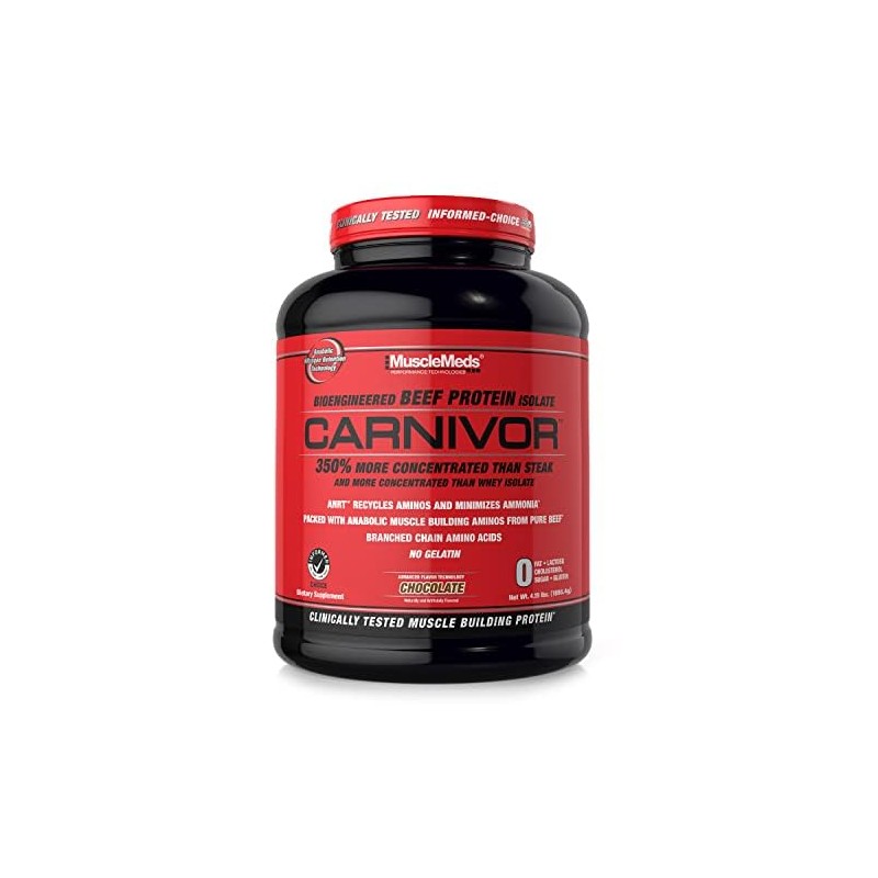 CARNIVOR Is The World's Best Selling Pure Beef Protein! CARNIVOR Beef Protein Isolate delivers all the muscle building power of beef with greater amino acid levels than other protein sources used in supplements, including whey, soy, milk and egg. CARNIVOR Beef Protein Isolate (BPI) is even 350% more concentrated in anabolic muscle building aminos than a prime sirloin steak! And it contains no fat or cholesterol! Plus CARNIVOR is one of the most delicious protein shakes youll ever try! The Muscle Building Power of CARNIVOR - Backed by Research* New research substantiates what you knew all along Beef builds muscle and strength! A groundbreaking clinical study presented at the 2015 International Society of Sport Nutrition (ISSN) conference in Austin, Texas showed that hard training athletes supplementing with CARNIVOR Beef Protein Isolate (BPI) gained an average of 7.7 pounds of muscle mass, while also increasing strength. Researchers gave test subjects CARNIVOR Beef Protein Isolate daily for 8 weeks while exercising 5 days weekly. Athletes taking CARNIVOR BPI experienced an impressive 6.4% average increase in lean body mass. In contrast, the placebo group did not significantly improve their body mass from baseline. * Sharp,et al., 2015 ISSN International Conference [Poster]. Muscle mass data based on male subjects. Lean body mass gains compared to baseline. Based on 2 scoops (46 grams protein) daily. Female subjects also experienced an increase in lean body mass. CARNIVOR is Informed-Choice Certified, tested for over 200 banned substances on the WADA list, and produced in a GMP Compliant Facility. You can be confident you are getting the highest quality product available