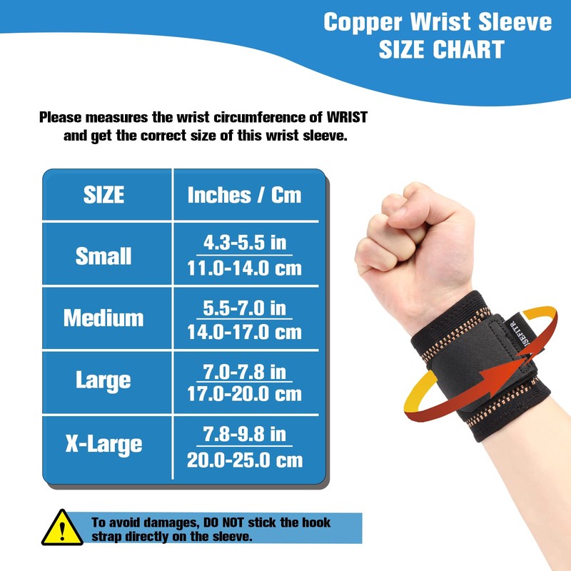 - GET YOUR WRIST SIZE: the copper wrist sleeve fit for women and men.Measure the wrist circumference to get the right size.Small for 10-14 cm ,Medium for 14-17cm, Large for 17-20cm X-large for 20-25cm.