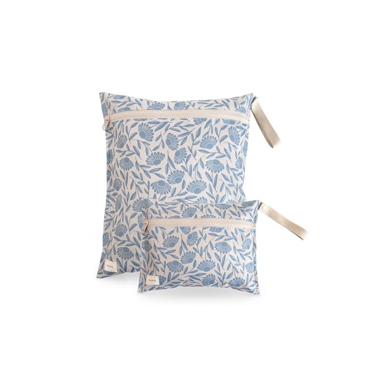 mushie Water Resistant Wet Bags | Large & Small Reusable Storage Bag for Baby Items and Travel | Zippered Pockets with Handle | Machine Washable, Set of 2 (Blue Flowers)