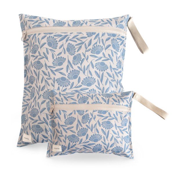 mushie Water Resistant Wet Bags | Large & Small Reusable Storage Bag for Baby Items and Travel | Zippered Pockets with Handle | Machine Washable, Set of 2 (Blue Flowers)
