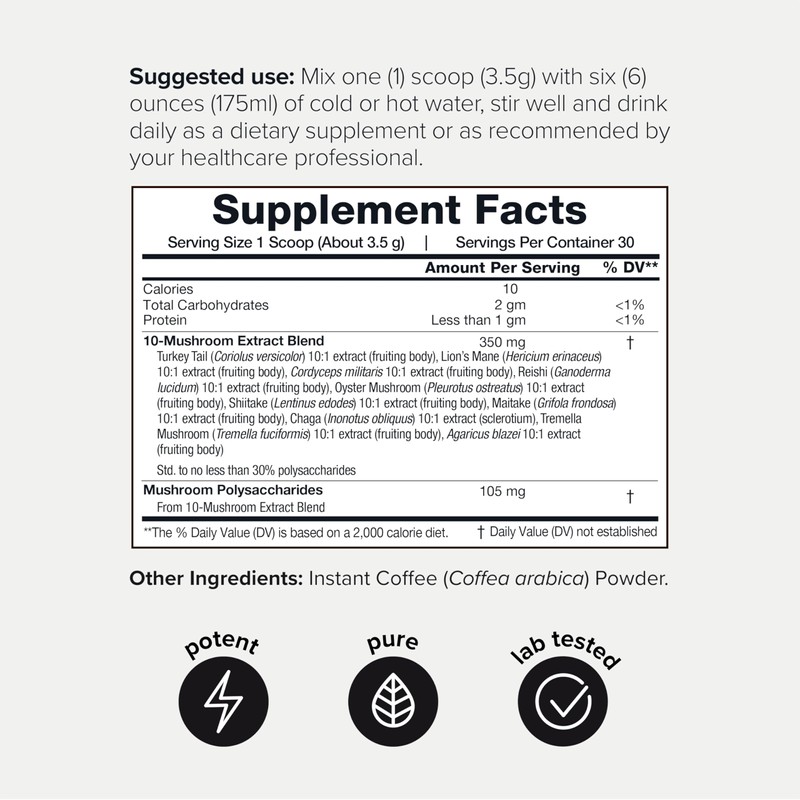 • Highly Concentrated 10 Mushroom Blend - Our Mushroom Coffee blend is formulated with a 10:1 extract ratio of ten potent mushrooms: Turkey Tail, Lion’s Mane, Cordyceps, Reishi, Oyster Mushroom, Shiitake, Maitake, Chaga, Tremella, Agaricus blazei. Each serving contains a 10:1 formula for each of these mushrooms to ensure the highest levels of potency and concentrated active compounds.