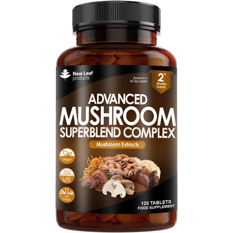 UNVEIL THE BENEFITS OF NEW LEAF'S MUSHROOM COMPLEX – New Leaf's Mushroom Complex is a premium blend of six potent mushrooms, carefully selected to support your overall health and wellness. Packed with fiber, protein, and essential vitamins, these mushrooms are nature's adaptogens, known for enhancing resilience and vitality. Each tablet is rich in active ingredients, including beta-glucans, natural polysaccharides celebrated for their beneficial properties.