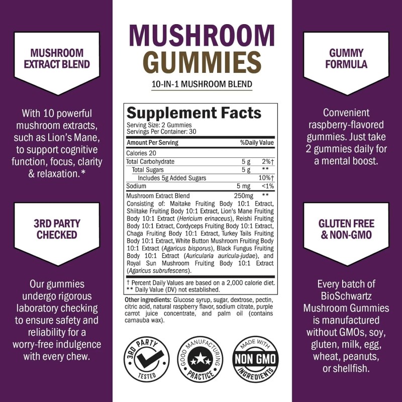 Mushroom Gummies for Adults - 10-in-1 Functional Mushroom Supplement for Mood