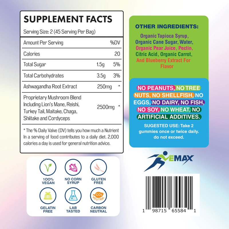 - Organic Mushroom Blend- Turkey tail, Maitake, Chaga, Cordyceps, Lion's Mane, Reishi, Shiitake and Ashwagandha. all combined in a mixed fruit flavor gummy with 45 servings per bag. Supports immunity with traditional medicinal mushrooms