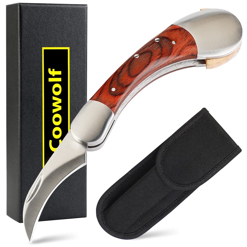 Coowolf Mushroom Knife with Brush and Sheath, Curved Stainless Steel Blade, Hardwood Handle, 7.1 Inch Folding Design, for Morels, Porcini, Chanterelles, Foraging Mushroom Gifts