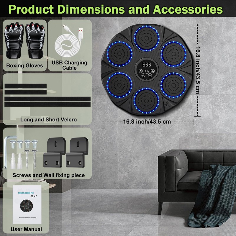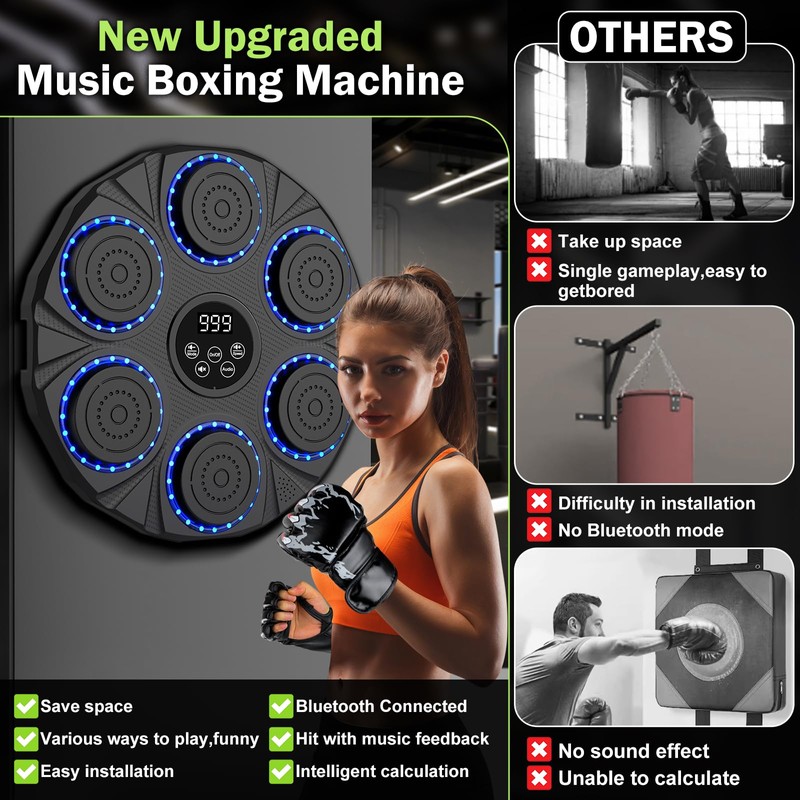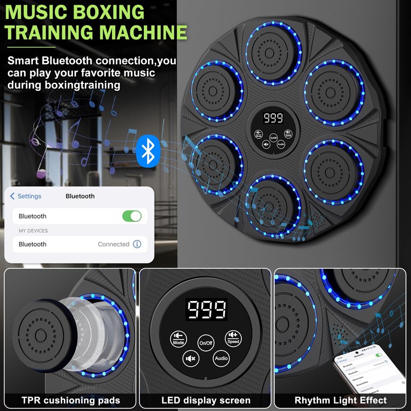 - Smart Music Boxing Machine: The boxing music workout machine comes with upgraded speakers,connects to your phone via bluetooth and plays your favorite music during boxing training,seamlessly blending the power of music with the intensity of boxing.When hitting a target,the device emits music and lighting effects,and the LED display shows your effective hit count,keeping you motivated and focused during training