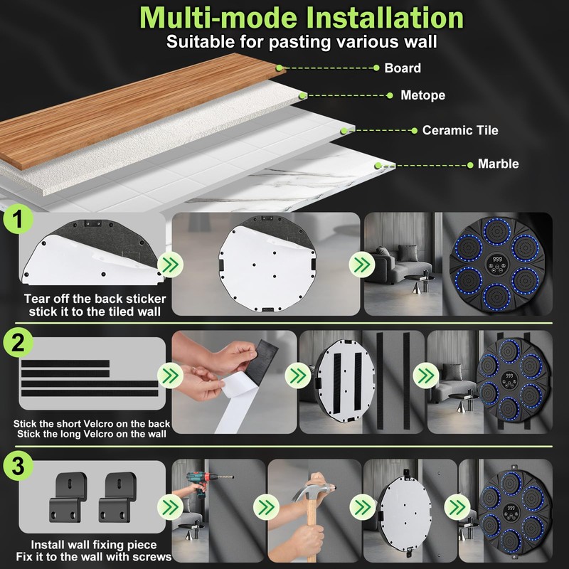 - Easy Installation: Our boxing music machine is wall-mounted,effectively saving space and time.Fix the bluetooth boxing machine with double-sided tape and Velcro on various types of walls,adjust the height according to personal preferences,without drilling holes.In addition,also provide you with wall fasteners and screws,which can be drilled for installation