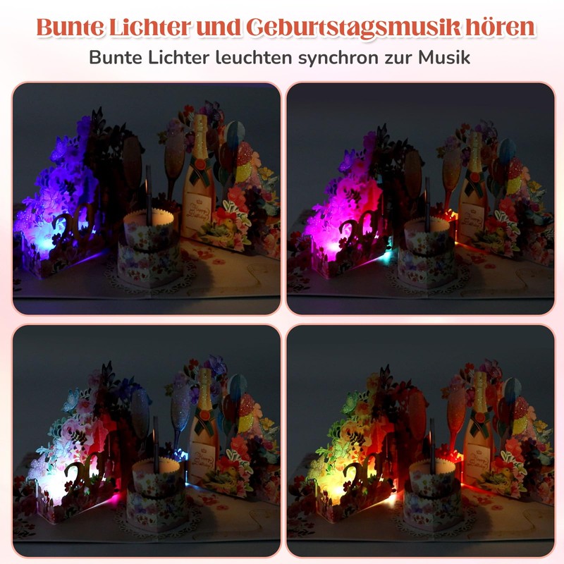 - Pop-Up Karte Geburtstag mit Musik & Licht: Diese 3D-Pop-up-Geburtstagskarte öffnet sich und enthüllt Champagner, Blumen, einen Schmetterling und einen Kuchen. Die Geburtstagsmusik ertönt und die bunten Lichter blinken im Takt der Musik. Wenn du die LED-Kerze auf dem Kuchen ausbläst, sagt sie "Happy Birthday".