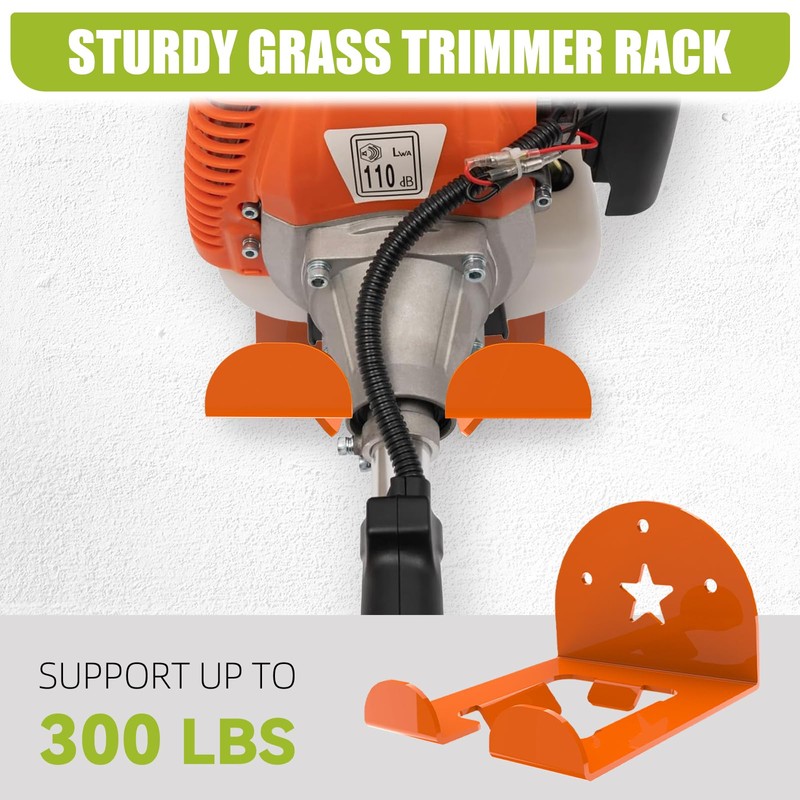 - 【Heavy Duty】The trimmer rack is made of alloy steel(300LB load capacity),which can stably hold your equipment. Each bracket features a durable orange powder coating and is paired with accessories coated in a black anti-rust layer, easily withstanding harsh environments such as humid garages and windy, rainy gardens, while providing water and rust resistance.
