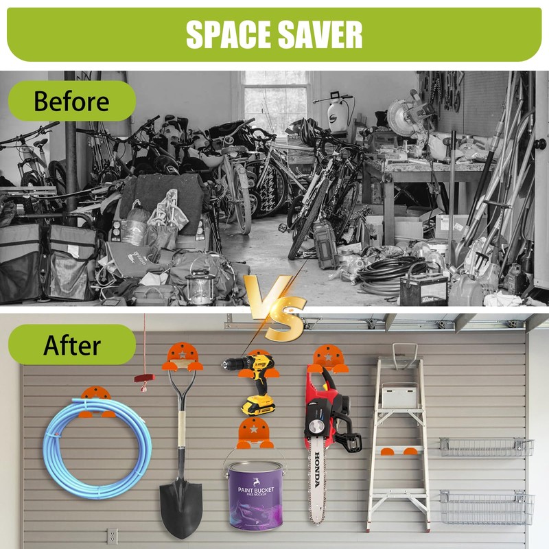- 【Space saving】Weed wacker hooks can hang and store the trimmer, keeping it off the ground, making effective use of vertical space, freeing up the ground space in areas such as garages and sheds, making the site more tidy and orderly, and avoiding space waste caused by random placement of tools.