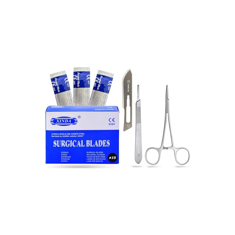 - ✔️ MuskalMed 100 Sterile Carbon Steel Blades #10 With Free Scalpel Handle #3 And Blade Remover Hemostat