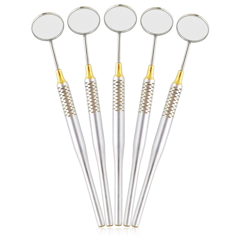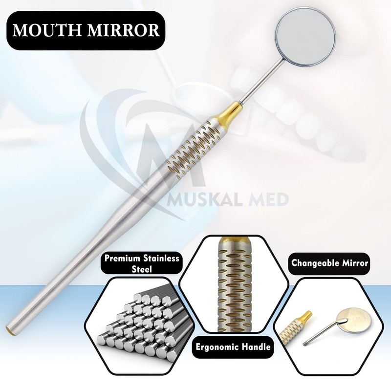 - ✔️ 5 Piece Dental Mouth Mirror Head #5 With 5 Stainless Steel Chrome Plated Gold Titanium Finish Handle Especially Designed Back End For Better Percussion While Diagnosing.