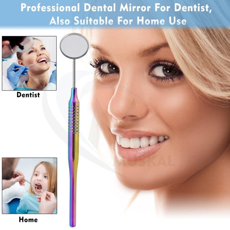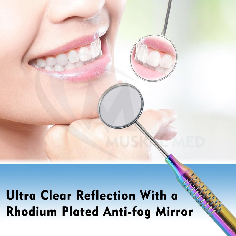 • ✔️ 5 Piece Dental Mouth Mirror Head #5 With 5 Stainless Steel Chrome Plated Multi Rainbow Finish Handle Especially Designed Back End For Better Percussion While Diagnosing.