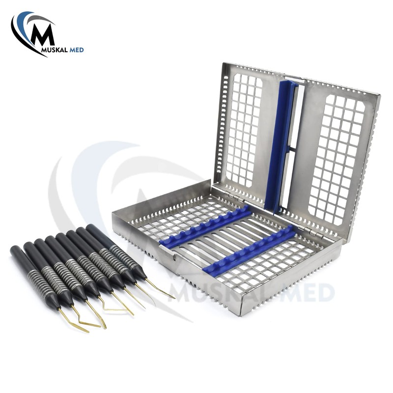 MuskalMed Professional Dental Instruments Osteotome Periotome Luxating Elevator | Orthodontic PDL Teeth | Surgical Root Extraction Spreading (Flex Periotome Titanium Set Of 8 With Cassette)