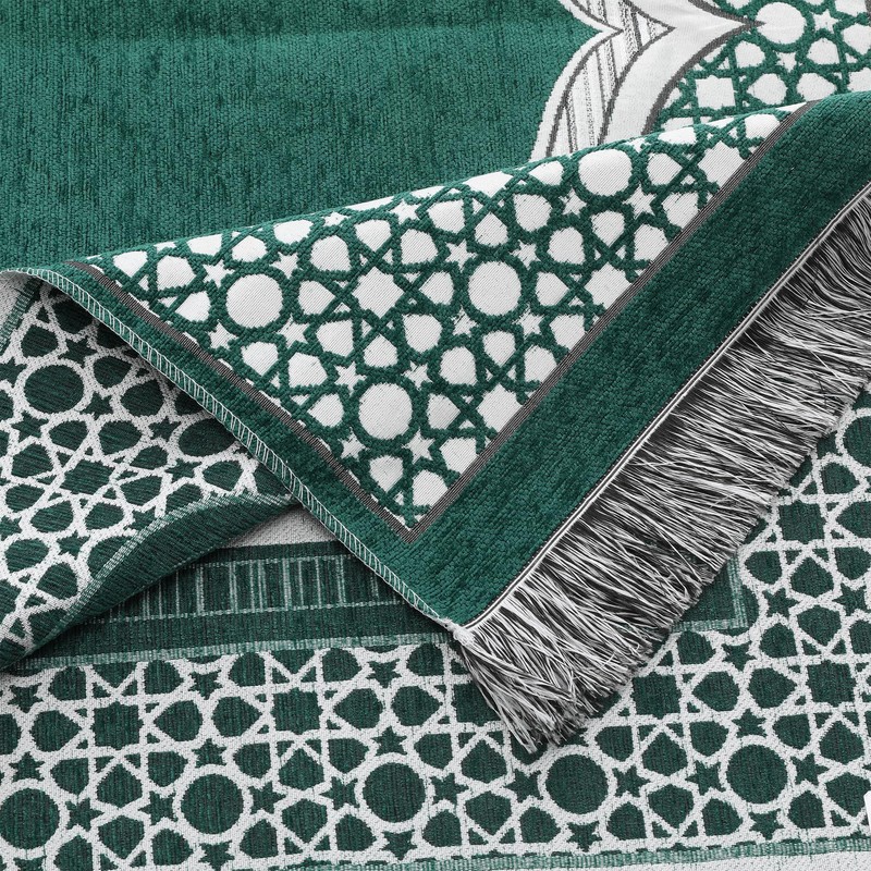 - Design: The pattern of this portable prayer mat is a mosque and the exterior dotted with stars. And the vertical edge of the blanket was embellished with tassels. This muslim rug looks very beautiful and modest