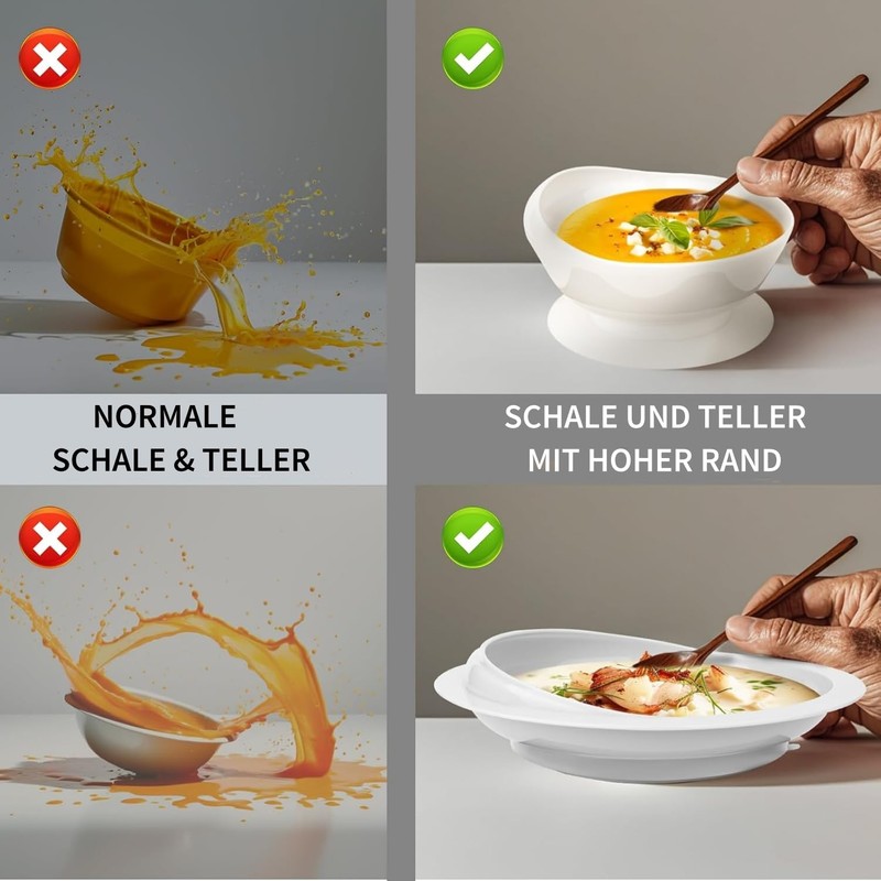 - ✔Leak-proof helper for everyday use - This bowl and plate gadget features high edges, deep grooves and a contoured edge to effectively prevent food spills. It allows Parkinson's patients, people with arm injuries and stroke patients to eat independently with one hand without suffering from tremors during meals. Ideal as a gift for seniors.