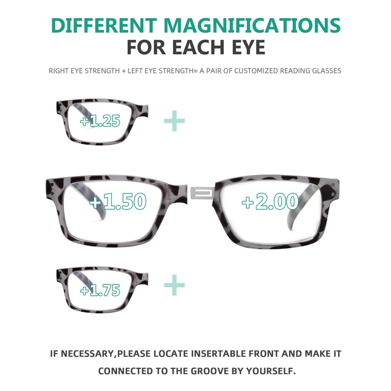 • ►[ CUSTOMIZED DESIGN ] - This reading glasses is designed to meet the needs of farsighted people who have different diopters in each eye. You can choose different lens power directly on your reader.