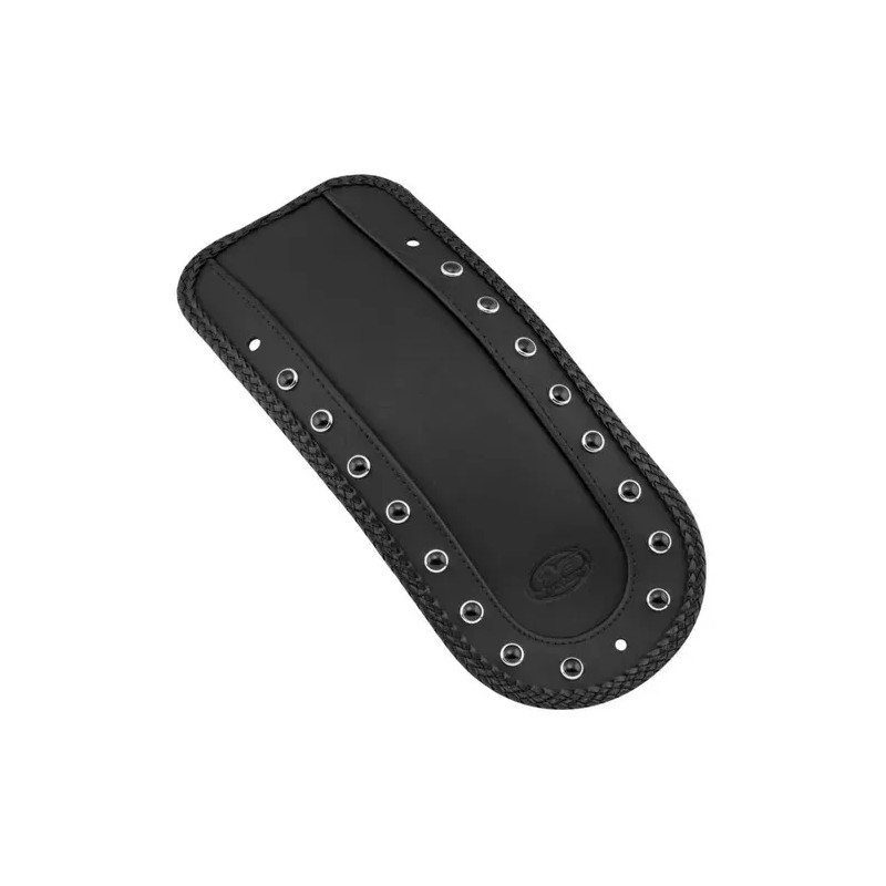 Unique and stylish way to cover the rear fender when converting from the two-up to a solo seat. Constructed of marine-grade vinyl and backed with felt, it will last for years and not harm your paint job. Plain style bibs match your stock, a Mustang or any other seat. Uses the existing seat mounting hardware and fits perfectly to the contour of the fender for no gaps.