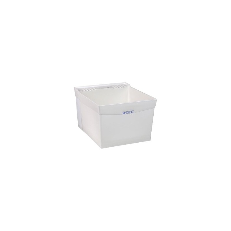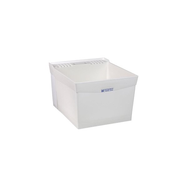 This is a Mustee wall-mount laundry tub in the color white. It is produced with Mustee's proprietary structural thermoplastic resins and innovative cellular molding process creating extreme strength & durability with a 18 gallon capacity tub with a smooth surface. This laundry tub features leakproof, integrally molded-in drain with stopper and includes wall mounting bracket, side supports, and mounting hardware for securing tub to concrete or stud wall. Included is a large, self-draining back shelf with retainer curb that prohibits water run-off except into tub. Connects to standard 1-1/2" P or S trap.