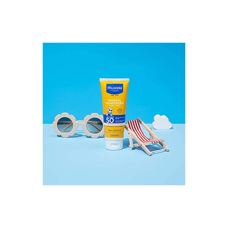 Product DescriptionMustela's SPF 50 Mineral Sunscreen offers safe and effective daily sun protection for babies, children, and the entire family. Our mineral sunscreen can be used on your baby or child's face and body and is water resistant for up to 80 minutes, formulated with mineral UV filters, and safe for sensitive skin types. This fragrance-free, SPF 50 broad-spectrum sunscreen is formulated with 93% naturally derived ingredients, including coconut oil, macadamia oil, and vitamin E to hydrate skin while protecting your family from the sun's harmful rays. The lightweight, sheer texture blends easily and does not leave a white cast on skin. Our daily hydrating sunscreen is compliant with Hawaii's sunscreen ingredient requirements and considered reef-safe. Backed by scientific research, developed in collaboration with healthcare professionals, and tested under dermatological control. Proven safe for use from birth on. Formulated without chemical UV filters (oxybenzone, avobenzone, octisalate, octocrylene, homosalate and octinoxate), parabens, phthalates, or phenoxyethanol. ACTIVE INGREDIENTS: ZINC OXIDE (24%) INACTIVE INGREDIENTS: WATER, C15-19 ALKANE, GLYCERIN, POLYGLYCERYL-3 POLYRICINOLEATE, ETHYL MACADAMIATE, CAPRYLIC/CAPRIC TRIGLYCERIDE, STYRENE/ACRYLATES COPOLYMER, STEARYL/OCTYLDODECYL CITRATE CROSSPOLYMER, LAURYL PEG-9 POLYDIMETHYLSILOXYETHYL DIMETHICONE, PROPANEDIOL, POLYHYDROXY STEARIC ACID, TRIETHOXYCAPRYLYLSILANE, 1,2-HEXANEDIOL, HYDROXY ACETOPHENONE, MAGNESIUM SULFATE, SODIUM CHLORIDE, CAPRYLHYDROXAMIC ACID, TOCOPHERYL ACETATE, SODIUM HYALURONATE, TOCOPHEROL, MALIC ACID.Brand StoryMustela, the skincare expert for babies and mothers-to-be for over 60 years.