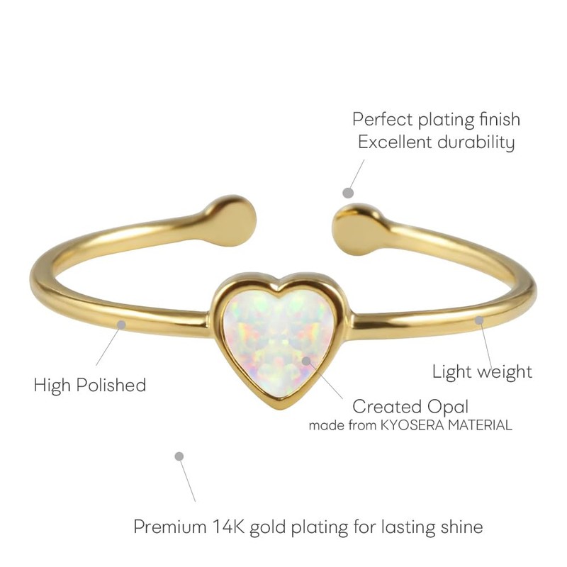 MUSTHAVE 18K Yellow Gold Plated Heart Opal Ring, White Opal Ring, Adjustable Size, Stacking Ring, Metal, Created Opal