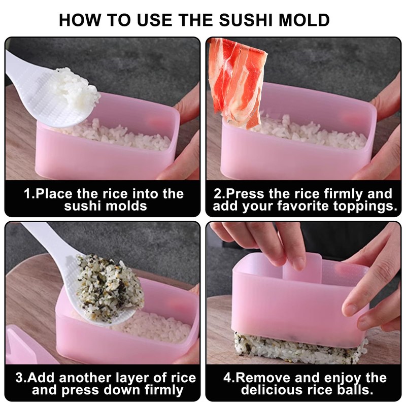 - 【Easy to Use】Using the onigiri mold you just need to scoop the rice into the sushi mold and flatten it, then put in your favorite food, press it tightly, take off the mold and use seaweed to wrap it up, then you can enjoy the delicious and nutritious sushi.
