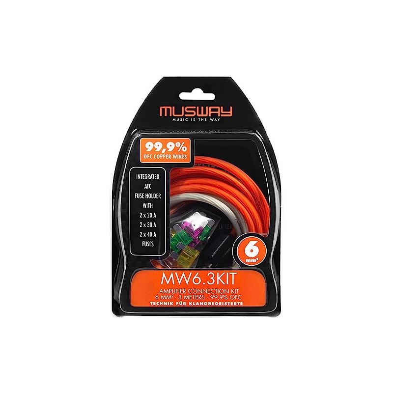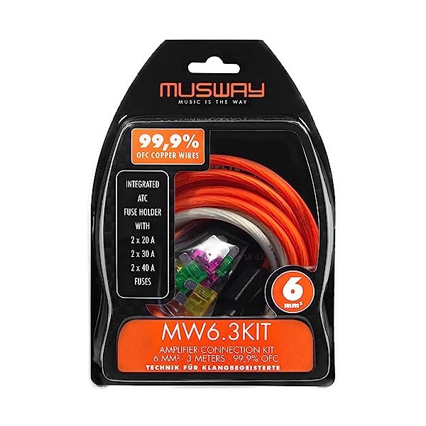 - Amplifier connector kit made of high conductive solid copper; 1 x 6mm² power cable (orange) 3 m; 1 x 6 mm² ground cable (silver), 1 m; ATC fuse holder; ATC fuses: 2 x 20 A, 2 x 30 A, 2 x 40 A; installation accessories