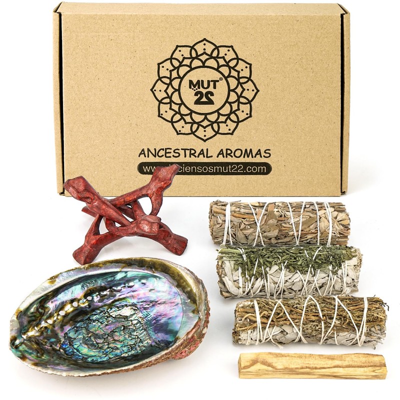 MUT22 Sahumerio Kit, Palo Santo, White Sage, Desert Sage, Rude, Abalone Shell, Tripod Stand - Complete Kit for Purification and Harmonization