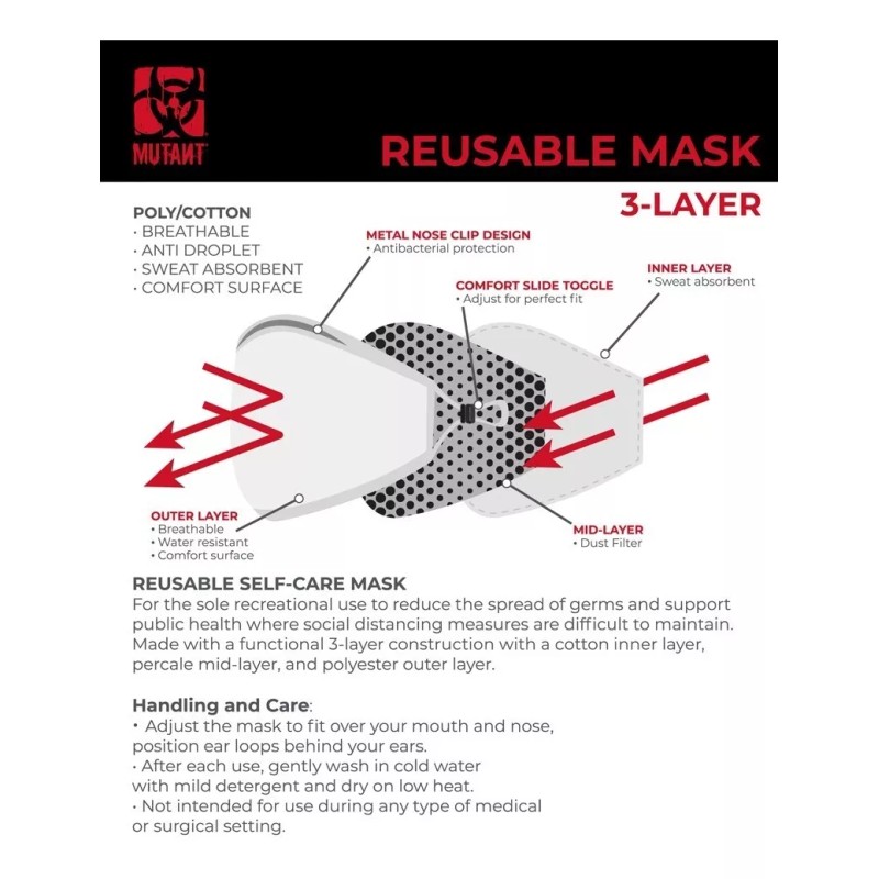 Perfecta para el interior y el exterior del gimnasio, la mascarilla facial MUTANT Re-Usable Carbon 2 Layer Super Air está hecha de poliéster / algodón transpirable con una superficie cómoda que es anti-gotas y absorbente del sudor.