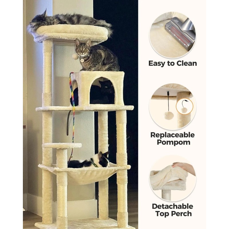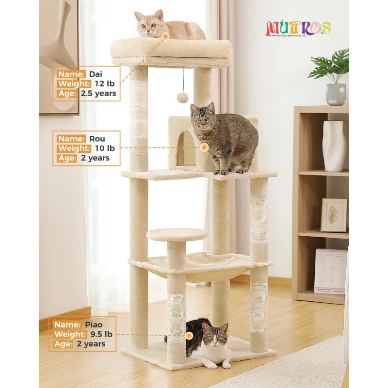 MUTTROS Cat Tree for Large Cats Adult with Metal Plush Big Hammock, 56.3" Cat Tower with 2 Door Condo House, 6-Tier Cat Shelves with Scratching Posts and Large Top Perch, Beige