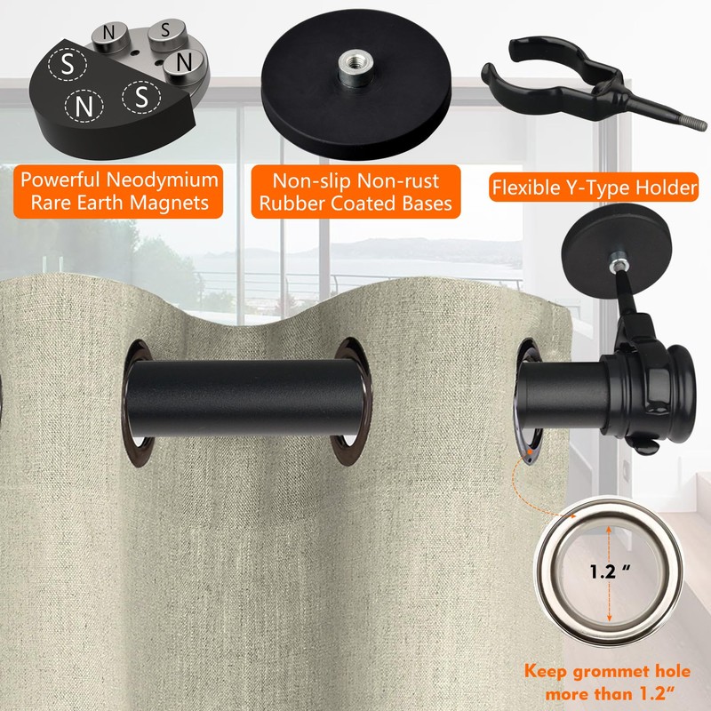 - [Strong Magnetic Mount Curtain Rods] 1 set of magnetic curtain rods for metal doors with no drilling. Universal rubber-coated holders have a strong magnetic pulling force, and can easily hold the magnetic curtain rod with window valences and lines