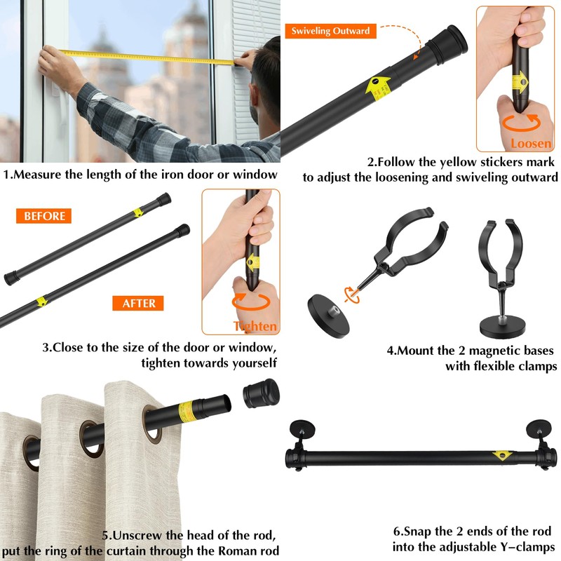 - [Curtain Rods Versatile Universal] Door curtain rods can be used for many occasions, easily attach anti-slip magnetic rods to metallic surfaces, and are a perfect solution for steel doors and fridges. No Drilling, no use nails. Easy to mount and adjust