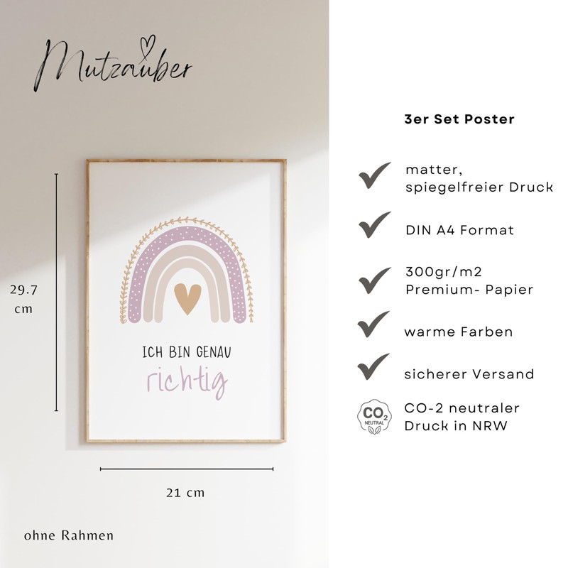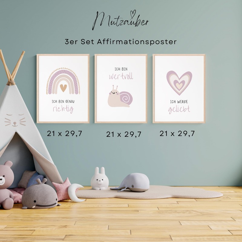 The Mutzauber's affirmation posters are more than just decoration; they are companions in your child's everyday life, promoting positive thought patterns and creating an atmosphere of security and well-being. With messages such as "I am valuable" or "I am always enough", they support the development of a strong self-image and a resilient personality.