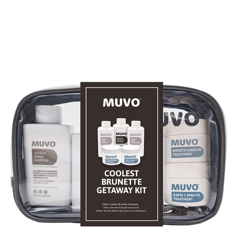 The Muvo Coolest Brunette Getaway Kit is a travel-sized hair care kit that provides everything you need to refresh and maintain brunette hair while on-the-go. This kit includes the Muvo Coolest Brunette Shampoo, which has a maximum strength and moisture-rich formulation that refreshes rich-cool brown, reduces copper, and adds gloss to achieve deep, vibrant brunette hair. The Muvo Totally Naked Shampoo is also included, which is a luxurious hydrating formula that cleanses, nourishes, and maintains healthy, vibrant hair. The Muvo Totally Naked Conditioner is a hydrating formula that deeply nourishes, detangles, and leaves hair feeling silky soft. The Smooth Leave-In Treatment is a lightweight formulation with Australian native Finger Lime Caviar & Desert Quandong that helps to protect from the sun and thermal damage whilst repairing, restoring gloss, improving manageability, and creating tangle-free, smooth hair. Finally, the Rapid 1 Minute Treatment is a rinse-out formulation featuring Australian native Finger Lime Caviar & Desert Quandong for a hydrating Vitamin C boost & antioxidants for optimum scalp & hair health. What are the benefits and features of Muvo Coolest Brunette Getaway Kit? Provides everything you need to refresh and maintain brunette hair while on-the-go. Maximum strength and moisture-rich formulation of the Coolest Brunette Shampoo refreshes rich-cool brown, reduces copper, and adds gloss to achieve deep, vibrant brunette hair. Totally Naked Shampoo is a luxurious hydrating formula that cleanses, nourishes, and maintains healthy, vibrant hair. Totally Naked Conditioner is a hydrating formula that deeply nourishes, detangles, and leaves hair feeling silky soft. Smooth Leave-In Treatment helps to protect from the sun and thermal damage whilst repairing, restoring gloss, improving manageability, and creating tangle-free, smooth hair. Rapid 1 Minute Treatment is a rinse-out formulation featuring Australian native Finger Lime Caviar & Desert Quandong for a hydrating Vitamin C boost & antioxidants for optimum scalp & hair health. Who is Muvo Coolest Brunette Getaway Kit for? This product is perfect for anyone who wants to maintain their brunette hair while on-the-go.