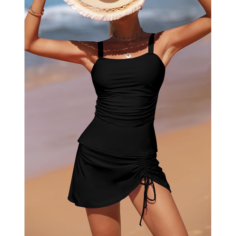 - STYLISH TWO PIECE SWIMSUIT FOR WOMEN This tankini swimsuit with skirt not only provides more coverage, but also the ability to style a complete bathing ensemble suitable for the beach or drinks on the beach. Stand out on the beach in this black tankini swimsuit featuring a square neckline and side skirt with drawstring