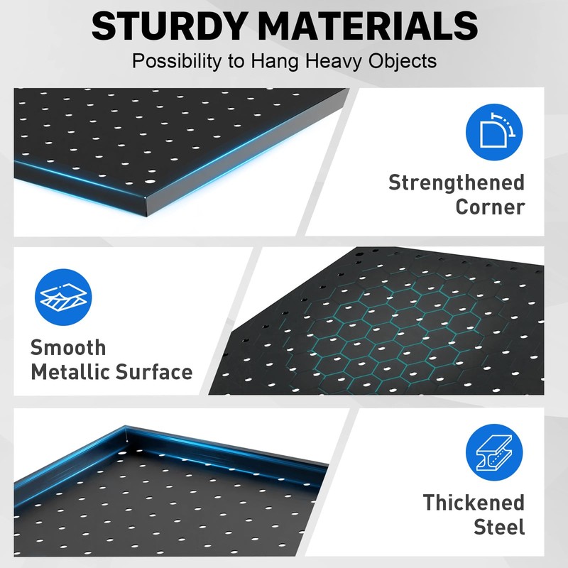 - HEAVY DUTY PEG BOARD: Metal pegboards are made of heavy-duty, sturdy steel. We have 10 times the weight capacity and strength of plastic pegboards. Don't worry about the pegboard falling off. These metal pegboard panels won't bend or buckle under the weight of many tools and can accommodate thick, sturdy hooks, wire baskets, wrenches and drills.