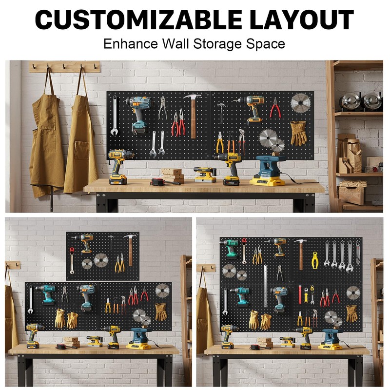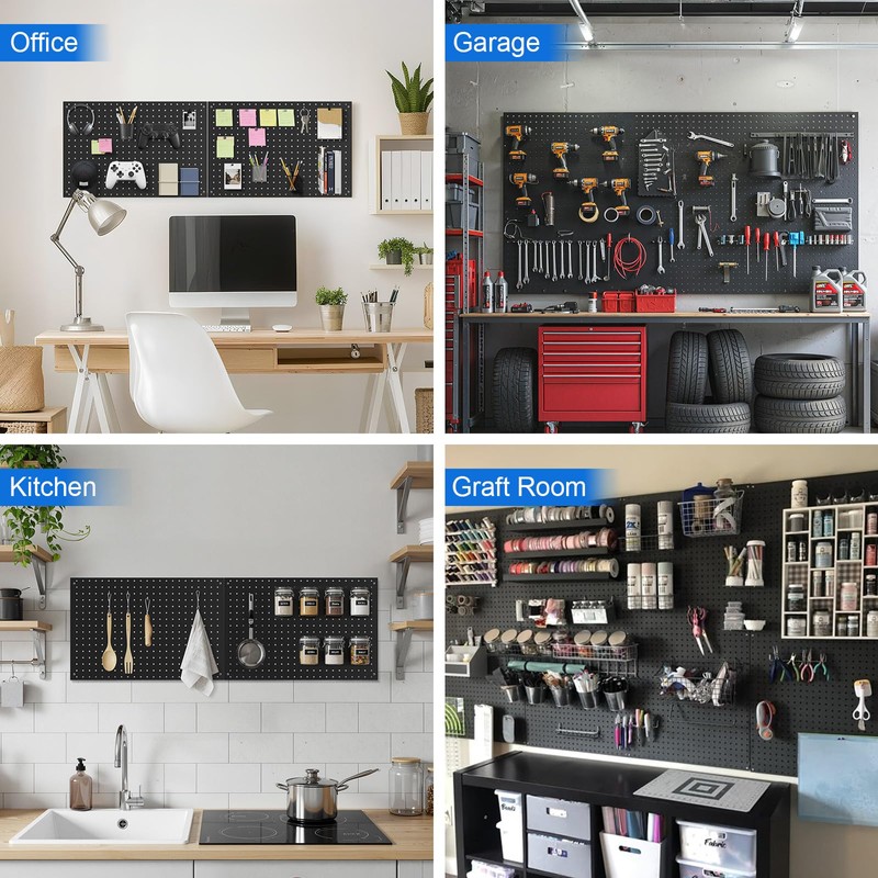 - WIDE APPLICATION: The peg board wall is suitable for garages, workshops, stores, kitchens, craft rooms and so on. If your area requires large size pegboards, you can order multiple sets of metal pegboard panels to DIY your area. Make the most of your wall space and keep your home space organized. This is a favorite product for DIY enthusiasts, tool organizers, store owners and office workers.