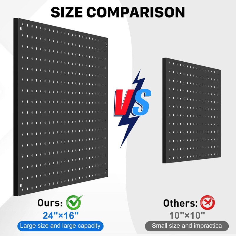 - PERFECT SIZE: Each garage pegboard measures 24 x 16 inches. Larger size for more storage than other pegboards. With 1/4 inch holes. 2 boards make 48 x 16/24 x 32 pegboard wall. You can DIY your favorite shape to optimize wall space.