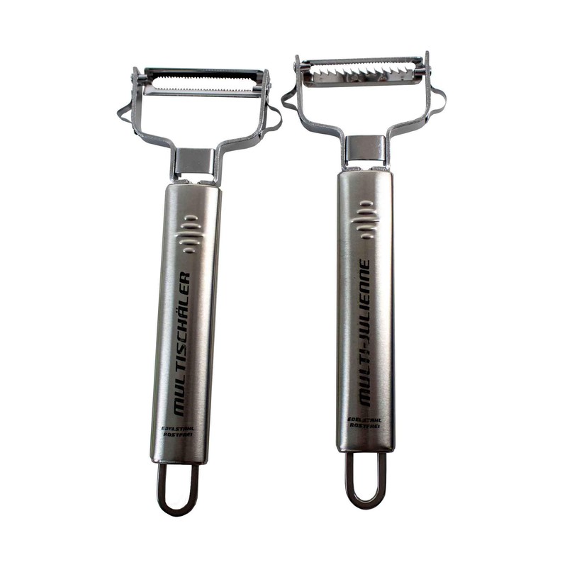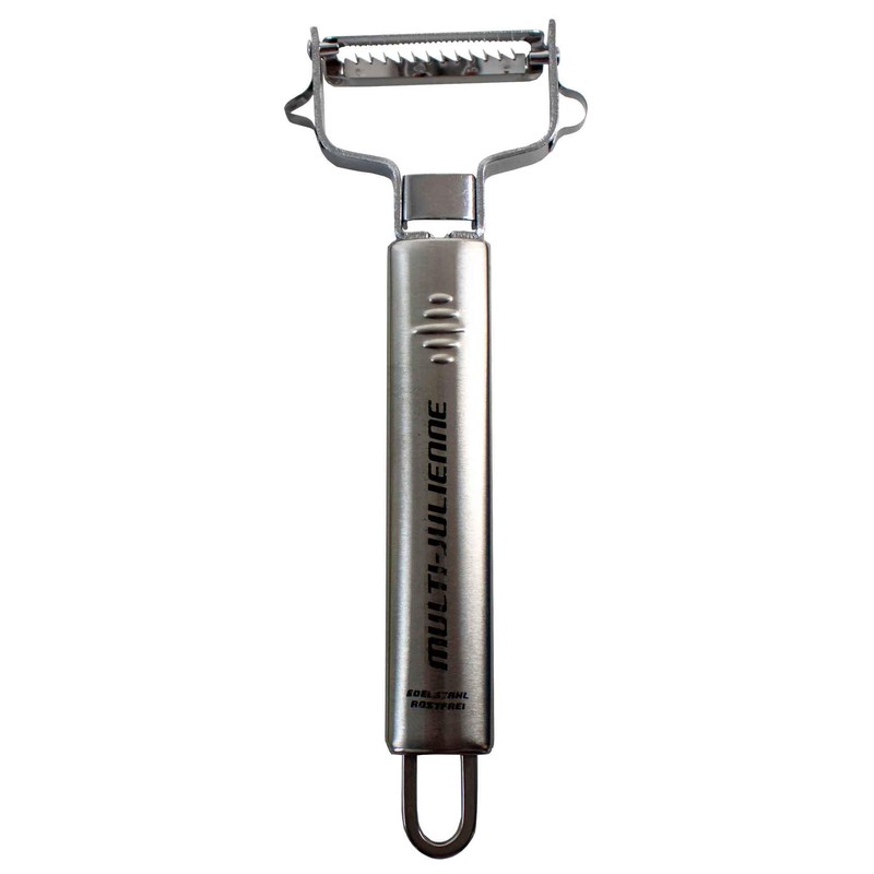 - Multi-peeler, particularly sharp, thanks to serrated blade and julienne peeler for zoodles in a set. With the practical planing board.