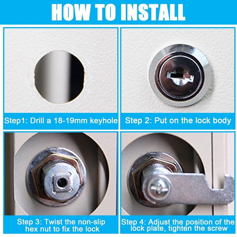 • 【Wide Application】- This standard size security cabinet locks with key can be installed on dresser drawers, filing cabinets, mailboxes, safes, tool boxes, cabinets, desktop cabinets, RVs. Easy to install, just drill a hole in the right place, insert the lock head, and secure the cam with the fastening screw