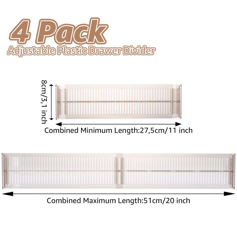 • Package size: Each pack contains eight transparent kitchen drawer organisers and six non-slip mats. Our drawer dividers separators are available in a width of 8 cm / 3.1 inches and an extendable length of 27.5 cm / 11 inches to 51 cm / 20 inches to meet the different needs of different drawer sizes.